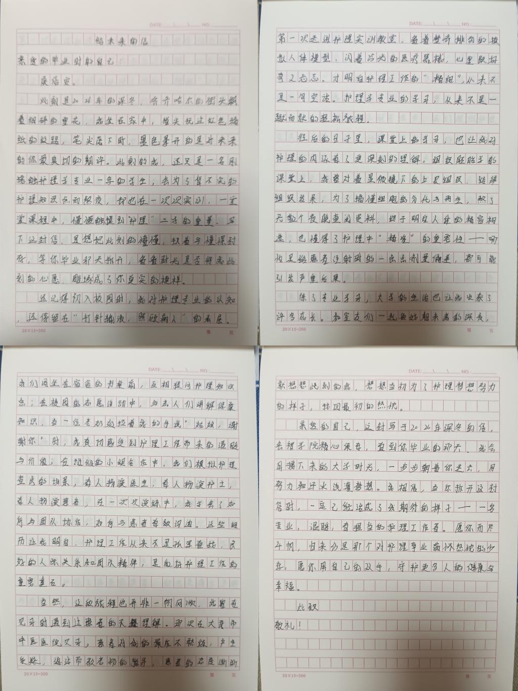 为践行南丁格尔誓言,书写青春担当,近日,齐齐哈尔工程学院护理专业YXY-096组(成员:张子为、栾子晗、黄红燕、高英娜)开展了“致未来的信”主题社会实践活动,以书信为媒,与未来对话,在字里行间镌刻成长感悟,立下青春誓言。