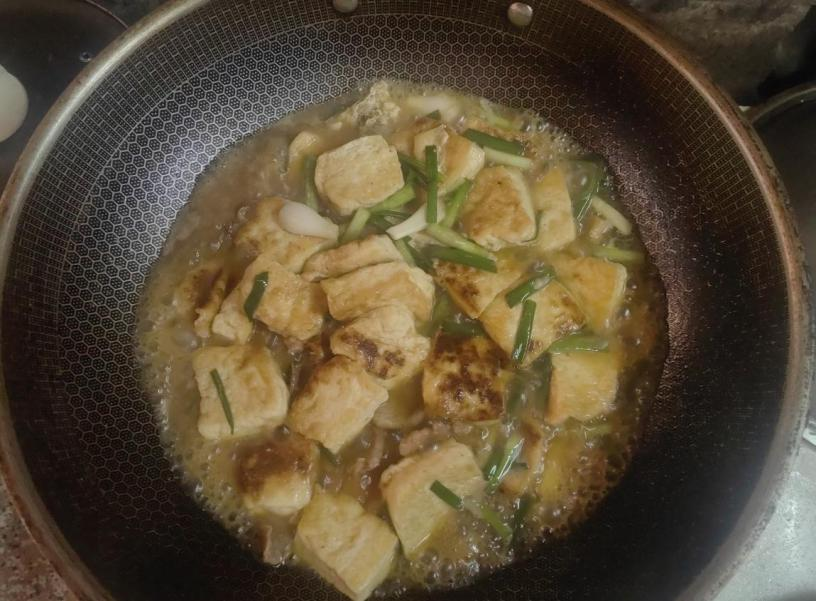 护理学231班庞东烽带来了猪肉炖豆腐美食制作分享。庞东烽同学先把老豆腐切成方块,用厨房纸吸干水分,下锅煎至两面金黄盛出;再把肥瘦相间的猪肉切丝,用生抽和淀粉抓匀腌制,下锅滑炒至变色盛出;接着用底油爆香蒜瓣,放入豆腐和猪肉,加生抽、蚝油调味,倒入没过食材的热水,大火烧开后转中小火炖5-8分钟,最后放入小葱段,加盐和白胡椒粉调味,翻炒均匀即可出锅。