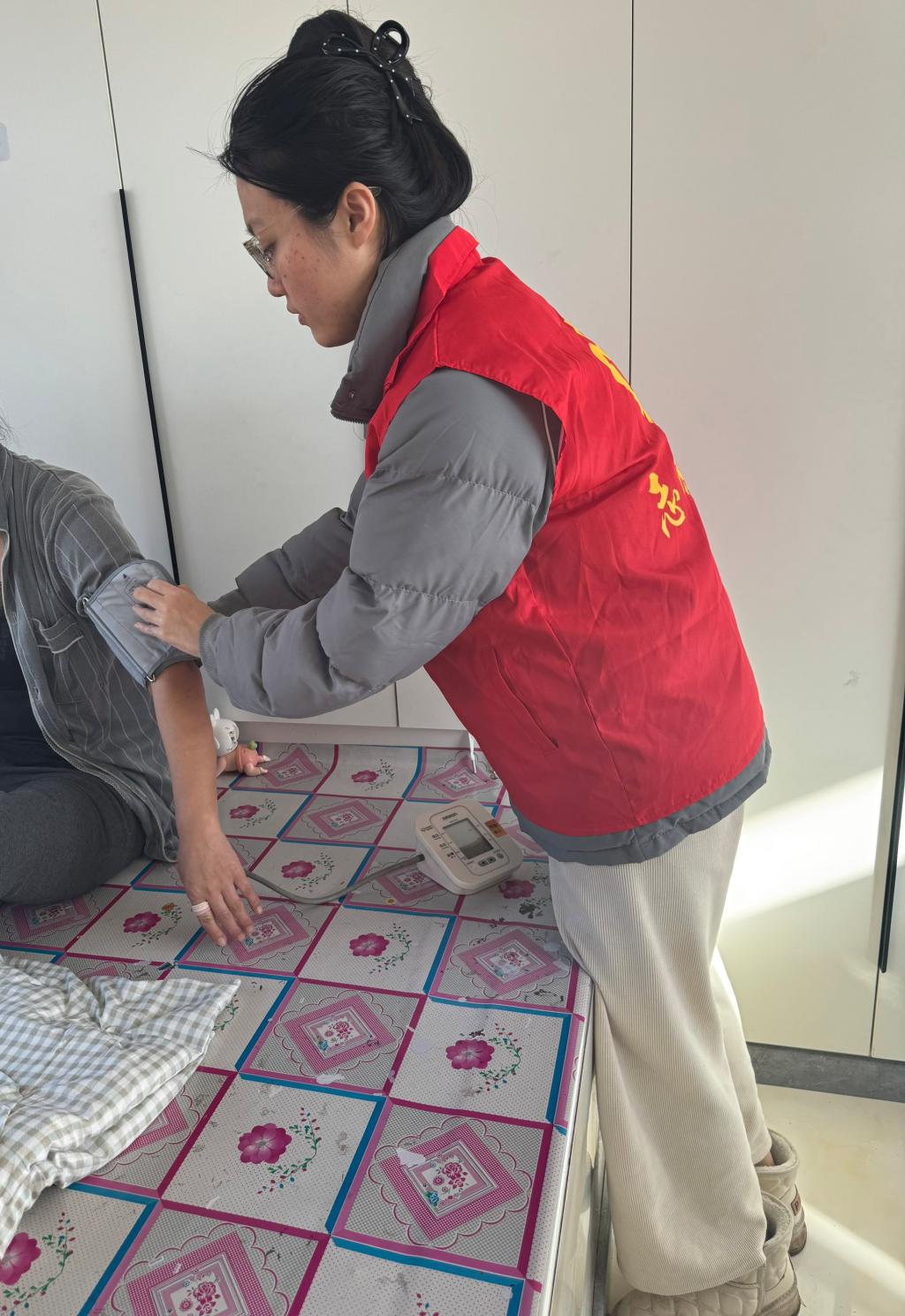 活动中,志愿者们带着医疗检测设备,逐户走进居民家中,耐心细致地为居民测量血压、体温和血糖,认真记录各项健康数据,详细询问居民的日常饮食、作息习惯和身体状况。针对老年人常见的高血压、血糖偏高等问题,志愿者们用通俗易懂的语言讲解健康知识,提醒大家合理膳食、适度锻炼、规律服药,鼓励居民树立健康的生活理念。对于检测中发现的血压、血糖异常情况,志愿者们也及时给予温馨提示,建议居民尽早到医院进行专业检查。志愿者们都热情交流、细心服务,让居民足不出户就能享受到便捷的健康检测,真切感受到了来自社会的关怀与帮助。