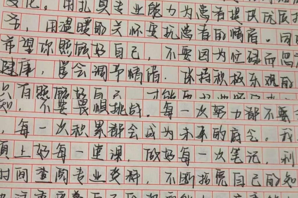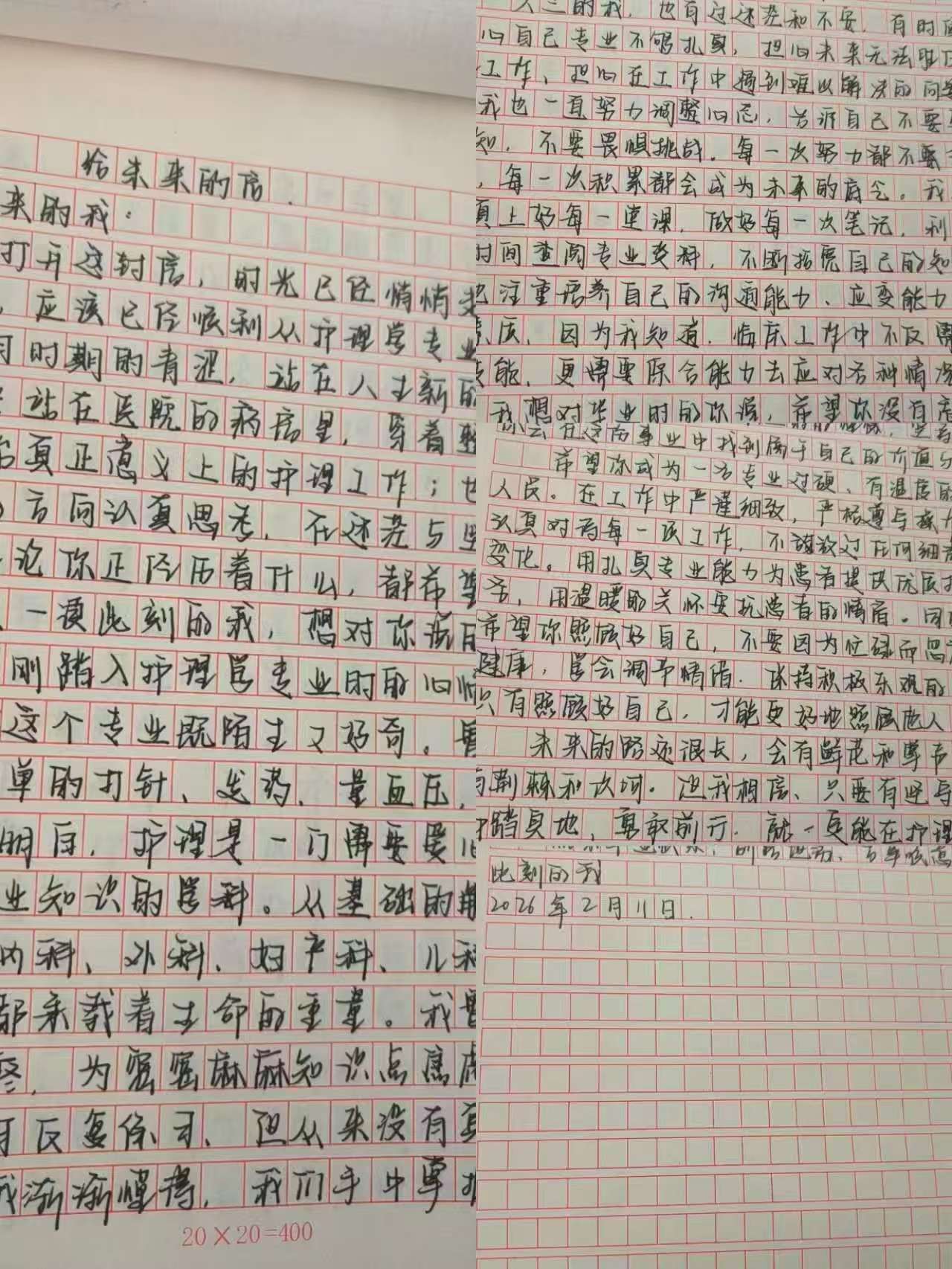 活动中,小组成员们纷纷执笔抒怀。周晶晶结合护理专业特色,写下深耕临床护理、守护患者健康的职业理想;刘轩诚回顾了在校期间的成长点滴,勉励未来的自己保持初心、勇毅前行;陈扬将对护理事业的热爱融入笔端,立志成为有温度、有担当的白衣天使;杨智超则规划了未来的学业与实践路径,决心以扎实的专业能力践行南丁格尔精神。