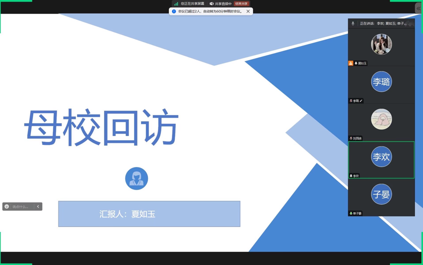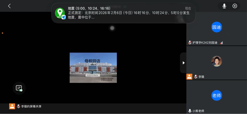 近日,齐齐哈尔工程学院医学院护理学231宋雨桐小组(成员:护理学K242班夏如玉、刘园迪、李璐,护理学231班宋雨桐)通过线上分享会的形式,集中展示了近期开展的“母校回访·青春接力”社会实践项目成果。从高中校园到初中课堂,到老师们前,学子们带着大学成长的收获与感悟重返母校,以线上形式,传递青春力量,延续师生情谊,展现了我校学子饮水思源、薪火相传的责任与情怀。