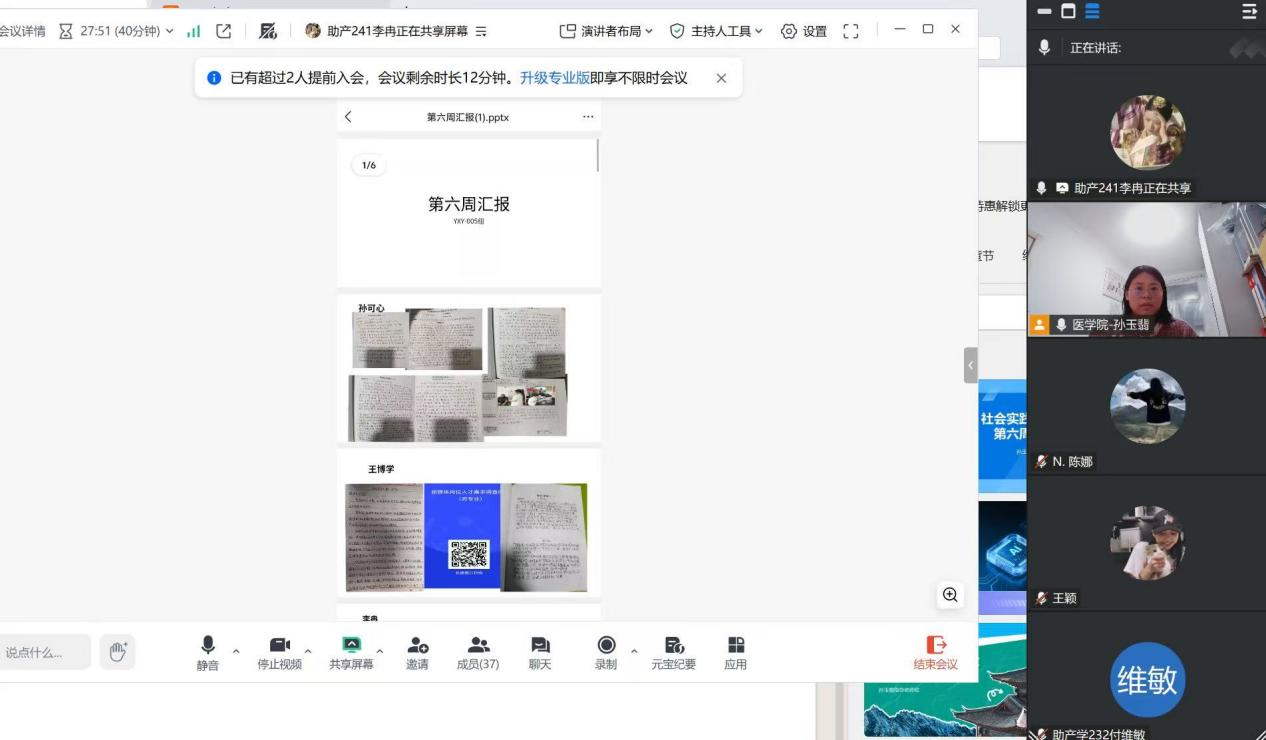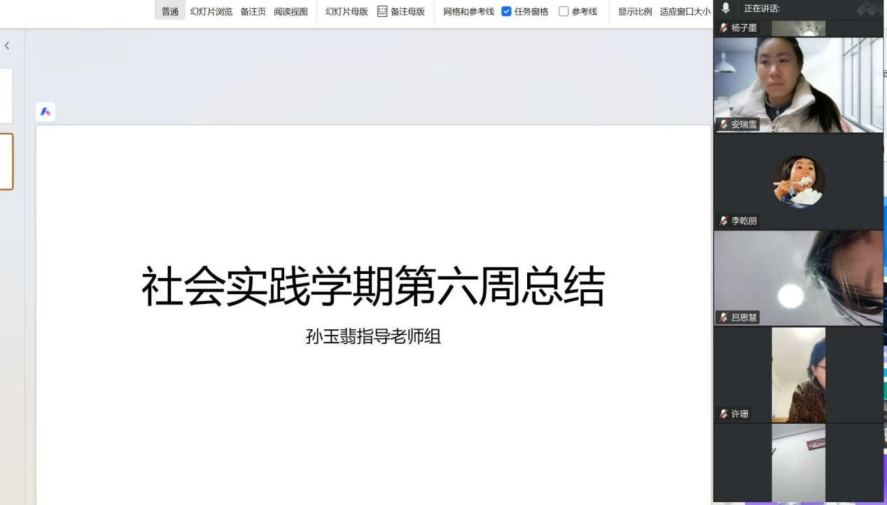 孙玉翡老师于2月13日20时00分在线上召开社会实践学期第六周总结会,系统复盘本周实践进展,明确下一阶段工作方向与重点任务。会前,孙老师提醒同学们提前准备汇报PPT,全面梳理各组第六周实践学习情况与阶段性成果。同学们认真总结本周实践内容,整理实践资料、归纳工作亮点、梳理现存问题,为线上会议的高效汇报做好充分准备。