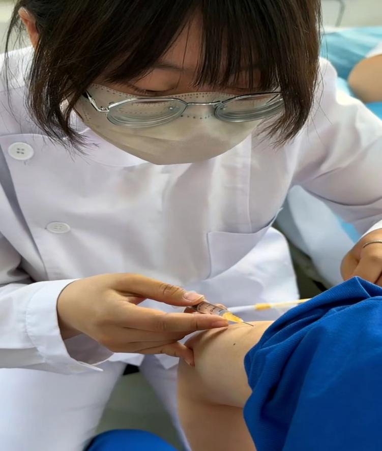 刘韵晗则在社区疫苗接种点承担注射工作。她严格遵循无菌操作原则,在注射前细致核对信息、安抚接种者的情绪。当针头精准刺入皮肤,药液缓缓推入的那一刻,她不仅夯实了基础护理操作技能,更深刻理解了“专业”二字背后,是对每一位居民健康的郑重承诺。