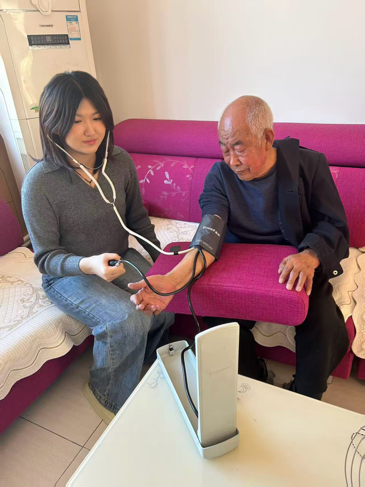 在社区志愿服务中,丁敬平为老人测量血压,她工作认真,态度温和,细致讲解日常护理、用专业知识为大家答疑解惑,把温暖与关怀送到居民身边。
