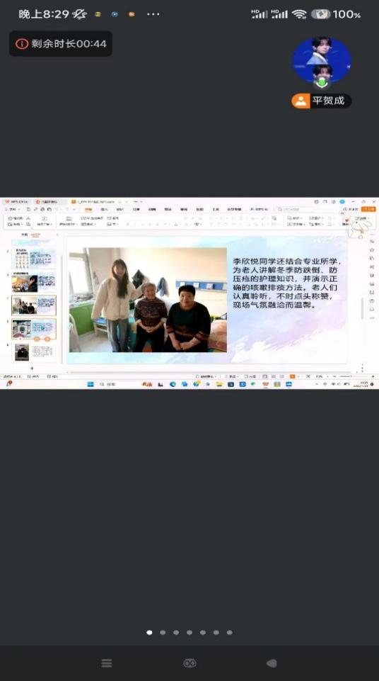接下来,YXY-047组和YXY-051组依次分享了本周作业完成情况。YXY-047组围绕手册作业、社会志愿行相关的企业调研与公益服务成果、各年级专业技能视频录制等内容展开汇报,提及因居家设备条件和学习经验有限,部分操作仍稍显生疏;YXY-051组重点介绍了本组在婴儿抚触相关实践及志愿服务中的表现,组员们分别在社区养老照护、健康监测、婚检中心接待引导等志愿服务中发挥专业所长,积累了丰富实践经验。