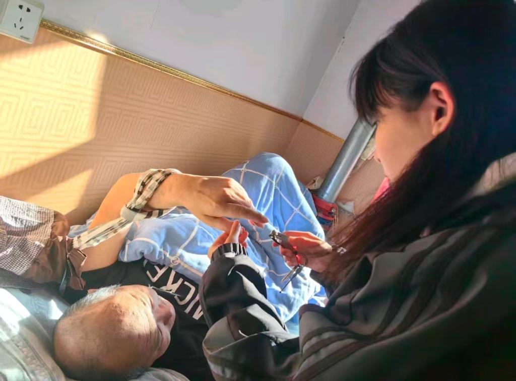 活动现场,同学们迅速进入角色,为老人们提供了细致入微的照护。她们为行动不便的老人修剪指甲,动作轻柔且耐心十足;陪老人拉家常,用亲切的话语驱散他们的孤单。阳光透过窗户洒在房间里,温暖了整个空间。