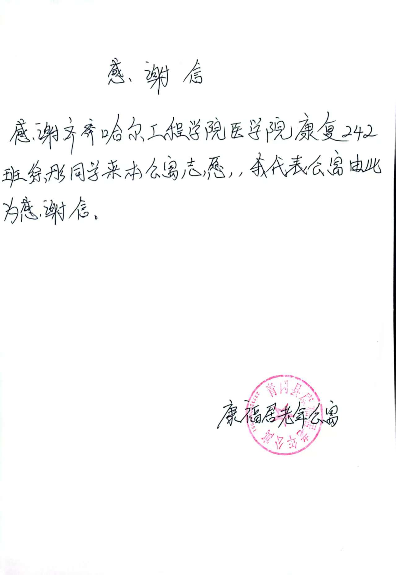 此次康复运动指导活动,不仅为养老院老年人送去了专业的健康服务,更让老年群体感受到来自社会的关怀与温暖,进一步提2026年1月,康复242班徐彤去了康福居老年公寓进行了康复运动指导活动,她们为入住养老院的老年群体提供一对一、专业化的康复运动服务,用实际行动守护老年人身体健康。