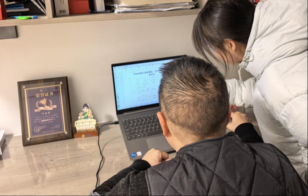 黄若馨同学在家乡的社区进行志愿服务,她主动协助社区工作人员梳理工作报表。在工作过程中,社区工作人员一边核对数据,一边细致讲解报表逻辑,黄若馨同学认真聆听、及时记录,积极主动提问交流,展现出踏实认真、虚心好学的良好态度。