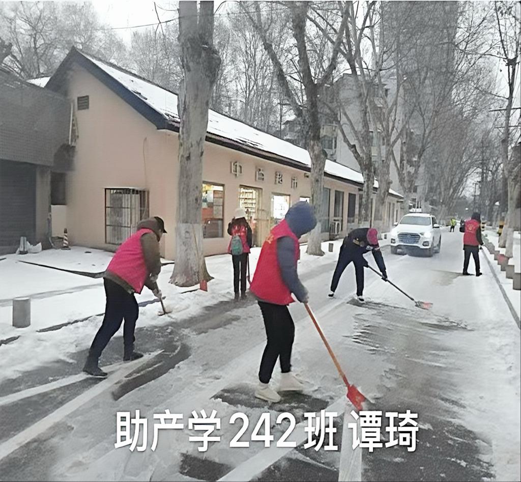 李佩窈:参与校园扫雪志愿服务,我收获良多,深受教育。为保障师生出行安全,我们齐心协力清理校园道路与楼宇周边积雪,以实际行动维护校园秩序。此次活动不仅锤炼了意志、增强了集体凝聚力,更让我深刻体会到“奉献、友爱、互助、进步”的志愿精神。劳动中,我践行了爱校荣校理念,强化了责任与担当意识。今后我将继续积极参与志愿服务,以青春之力服务校园、传递温暖。