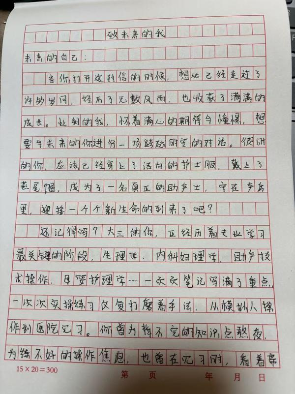 李金宇:写这封给十年后的信,让我对助产职业的理解更深刻,也明晰了未来的职业方向。身为大三助产专业学生,既有对职业的憧憬,也有对未知的忐忑,而这份十年规划,让迷茫有了答案。从夯实临床基础到深耕特色领域,再到成为复合型人才,每一步都凝聚着对这份职业的热爱与敬畏。我也懂得,助产不仅是专业技能的考验,更需要温柔的共情与对生命的坚守。这封信是期许,更是承诺,往后我会以初心为帆,以专业为桨,在守护新生的道路上稳步前行,不负时光,不负职业的神圣。