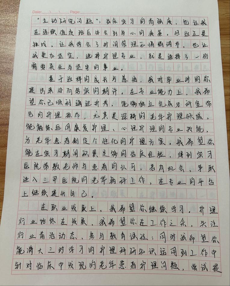 郭金彤同学深耕社会实践现场,用心捕捉见闻细节、沉淀真切感悟,将这段时间里的成长蜕变、认知升级尽数梳理,把对专业领域的探索思考、未来职业的清晰规划与个人理想的热忱追求,悉数落笔成文。文稿字里行间满含赤诚,既洋溢着青年学子的蓬勃朝气,更传递出笃定前行的信念与力量。其中饱含着对老年护理专业方向的热忱憧憬,期许未来能以专业知识为依托,用耐心与温情守护老年群体的健康与尊严,在细致照护中传递人文关怀,于行业深耕中践行职业使命。