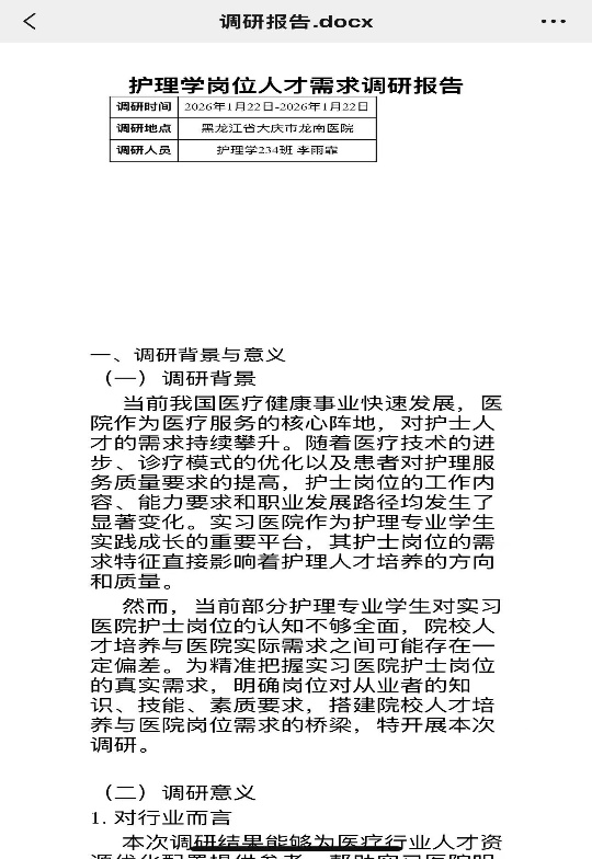 近日,护理学234班李雨霏团队在黑龙江省大庆市龙南医院开展的护士岗位人才需求调研完成,57份有效样本揭示了当前实习医院护士岗位的核心需求与发展趋势。