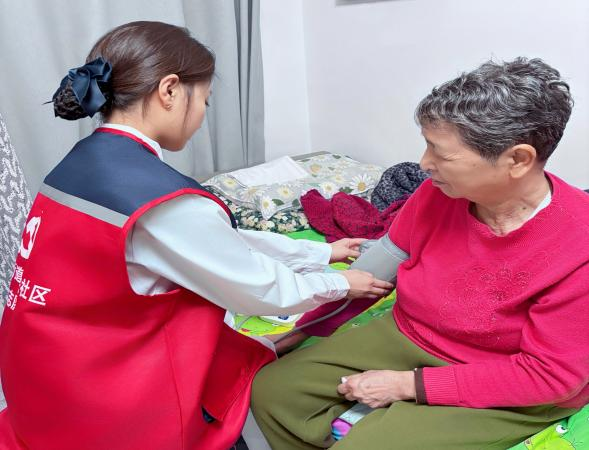 冯欣平走进锦安社区,为养老院常住老人提供上门健康服务,细致为老人们测量血压、精准记录数据,针对性开展健康宣教,耐心普及日常保健与常见疾病预防知识,以贴心周到的服务守护老年群体健康,切实践行志愿奉献精神。