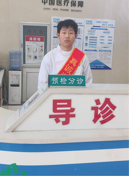 王建福同学在导诊岗位上,以绶带“真诚”为承诺,做好预检分诊,用专业指引为患者就医“导航”,在实践中践行青春担当。
