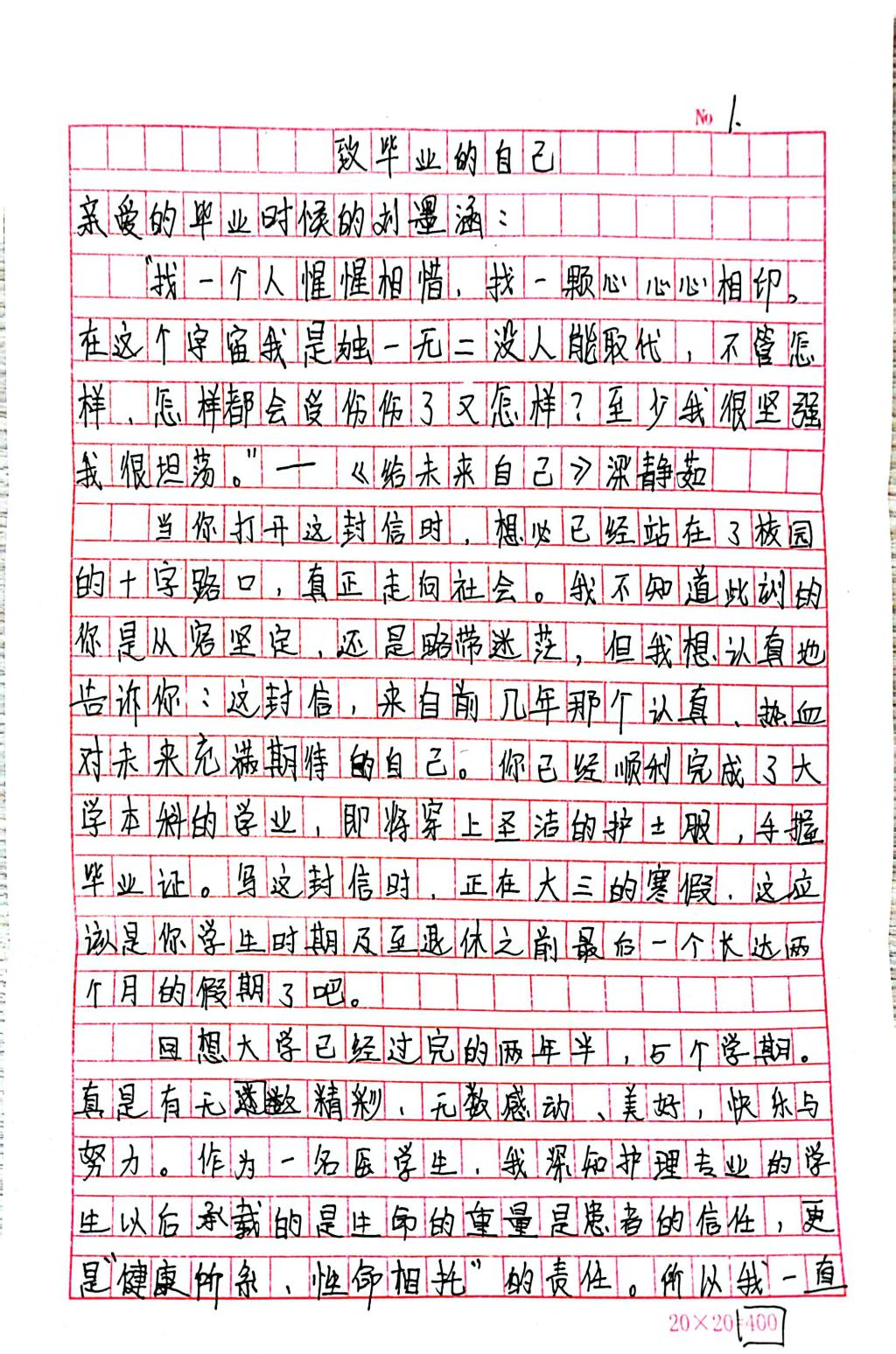 未来,刘墨涵将带着这封写给自己的信,在社会实践与临床实践中稳步前行,以专业坚守回应时代需求,在护理岗位上书写属于青年学子的成长答卷。