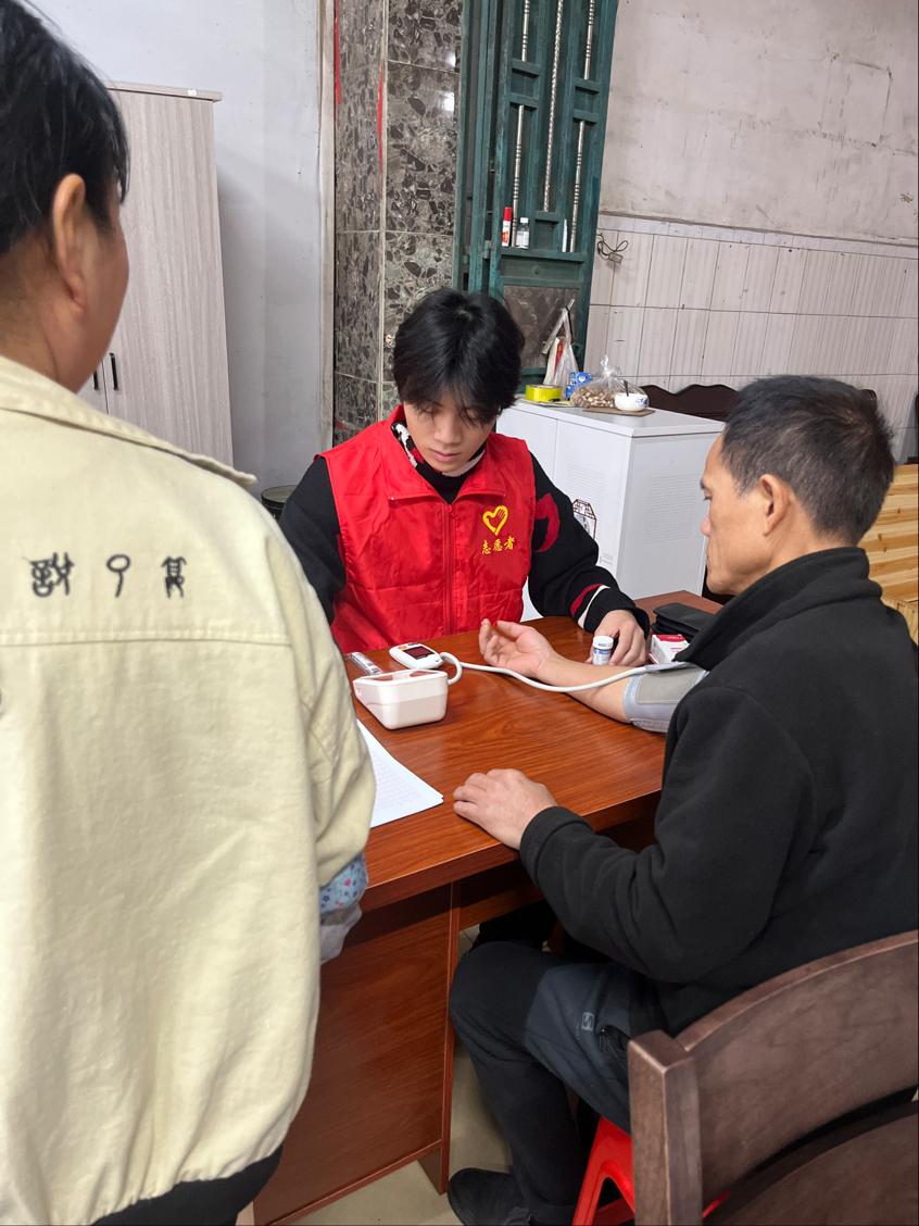 活动现场温馨有序。画面中央,一位身穿印有“志愿者”标识红色马甲的学生正专注地为居民测量血压,眼神认真,动作规范。一旁的居民安静配合,眼中充满信任。简单的木桌上,血压计、血糖仪、记录本等物品摆放整齐,学生们两人一组,有条不紊地进行操作、记录和讲解。