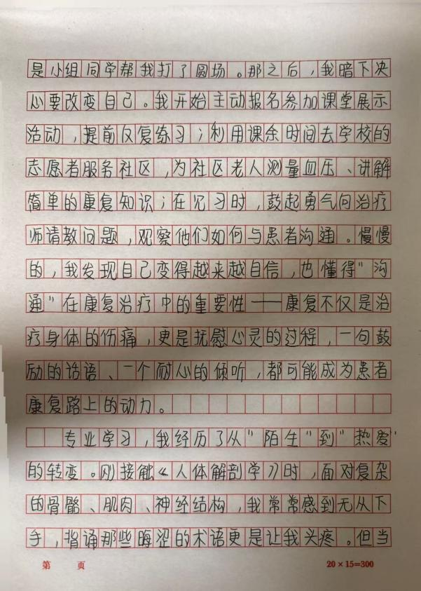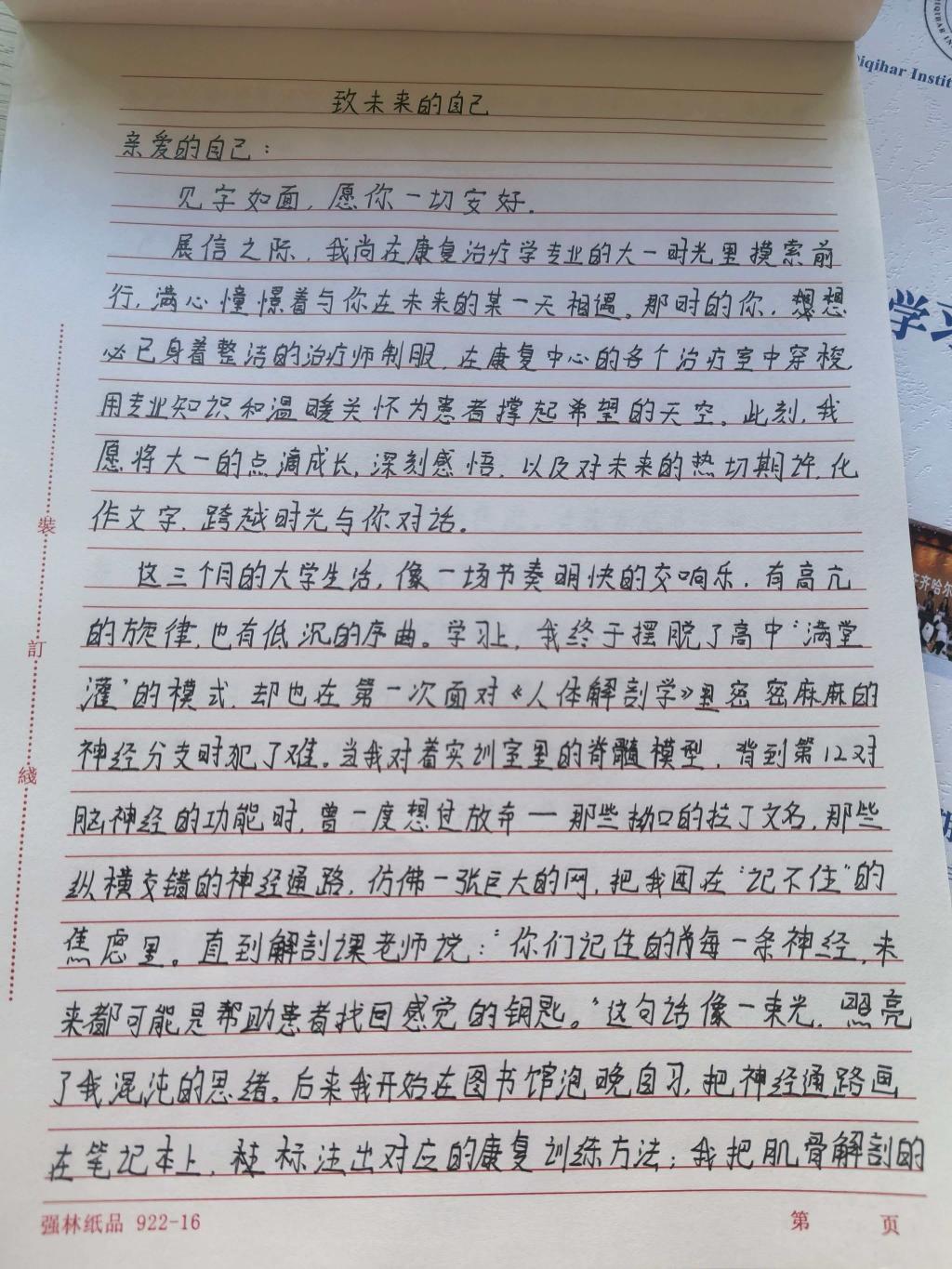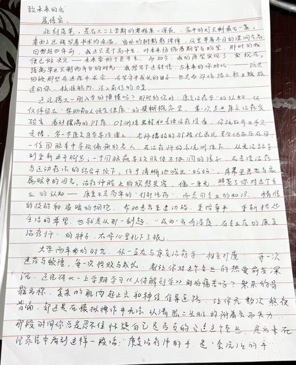 刘熙同学以一封书信致未来的自己,记录了康复治疗学专业学习的初心。他回顾实训中的忐忑与成长,立下用专业守护患者的誓言,尽显青年医学生的责任与担当。