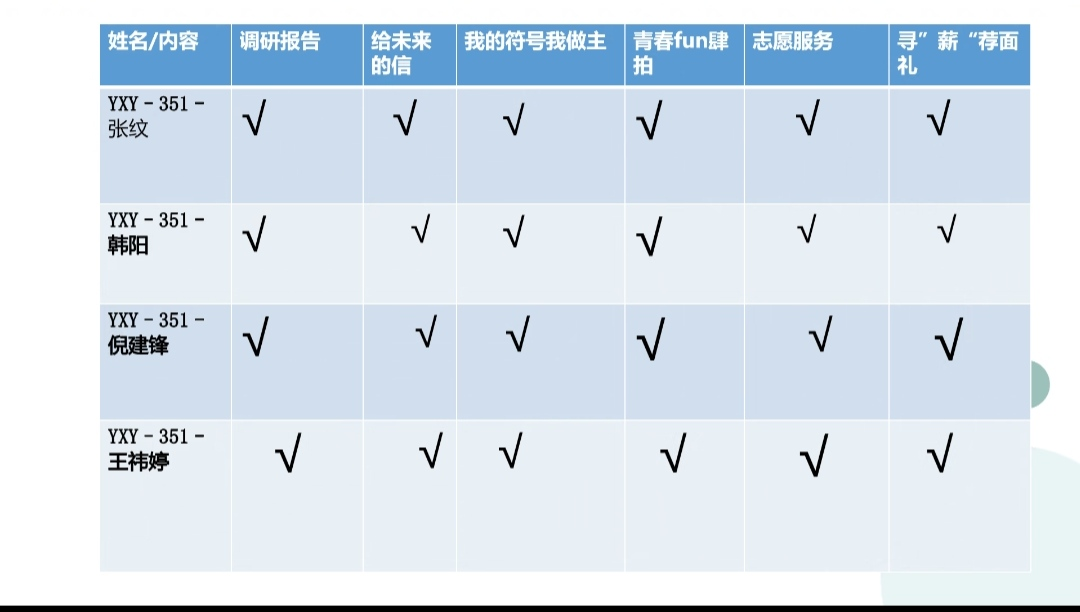 YXY-351组与YXY-356组通过PPT展示的形式,对本周社会实践工作进行集中复盘。两组同学依次汇报阶段工作成果,梳理整体推进情况与完成成效,整理实践过程中的经验与不足,并针对现存问题明确了后续整改方向与分工安排,为本次社会实践工作圆满收尾做好准备。