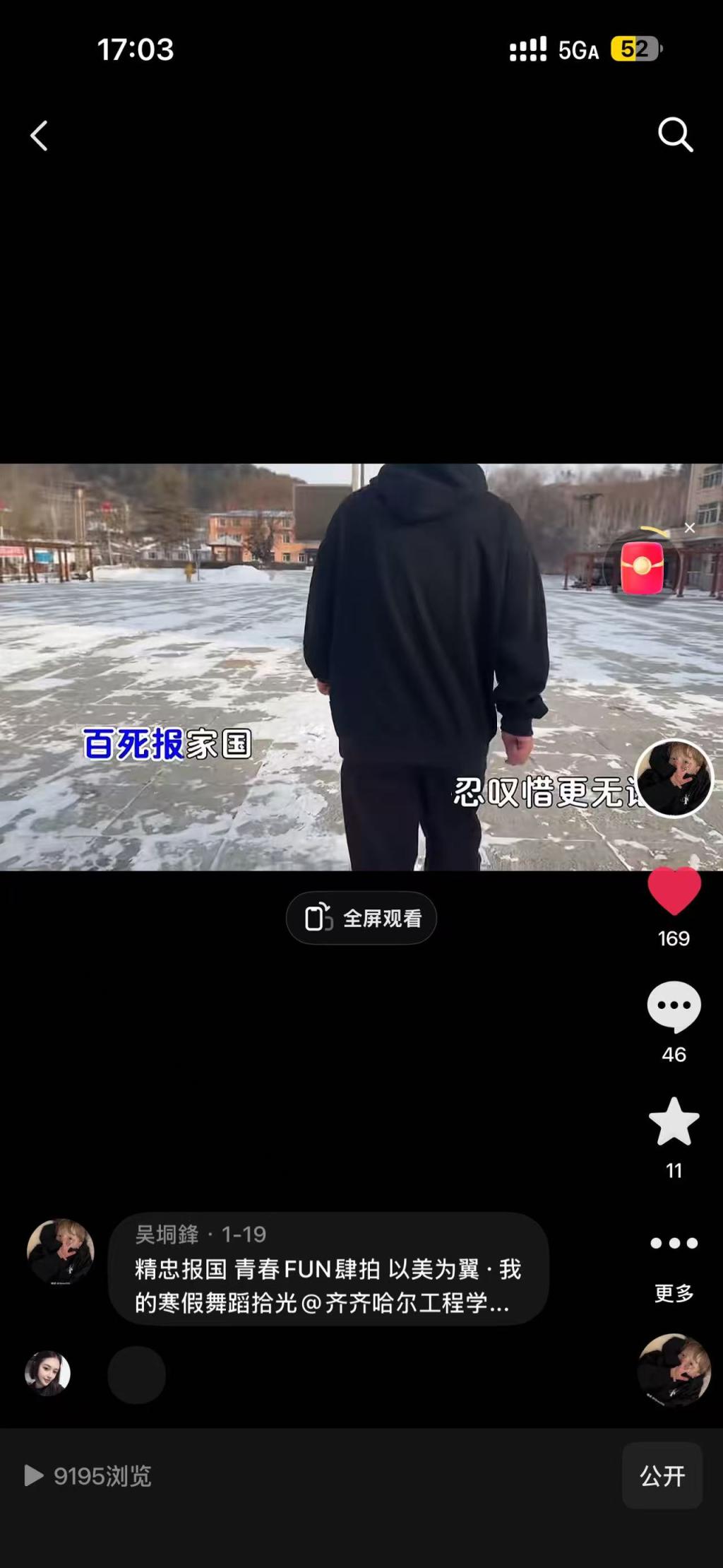 吴垌琒以“以美为翼”为主题开展寒假美育实践,精心编排并演绎《精忠报国》相关舞蹈,完成抖音视频创作与发布。他用灵动舞姿诠释青春担当,传递家国情怀,展现了青年学子的精神风貌。
