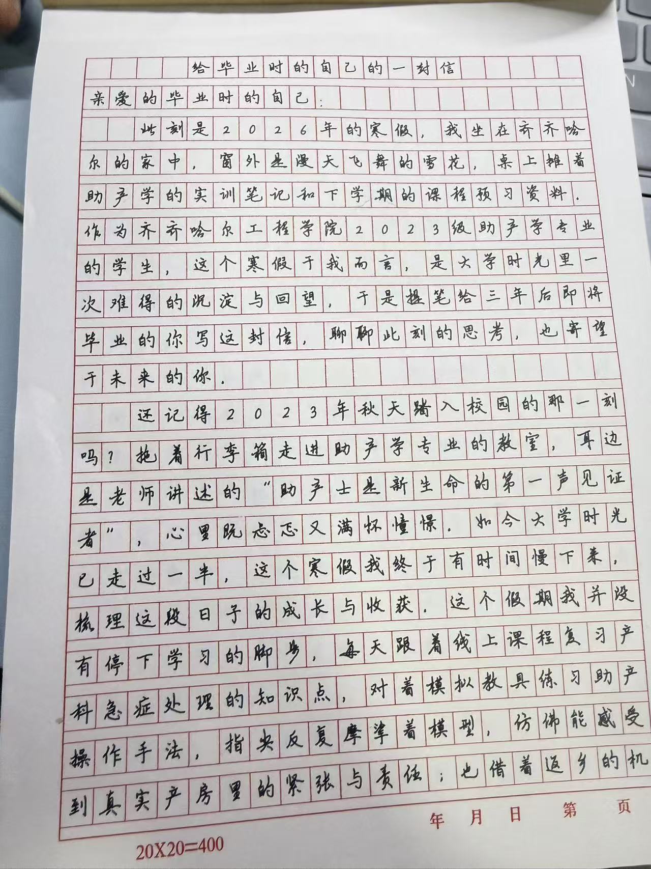 于子涵在信中写道,未来的自己,当以“中而至庸”为行事准则,在助产学专业的深耕中守心持正、稳中求进。专业学习上,将持续夯实理论基础,在临床实践中锤炼实操能力,以严谨的态度对待每一次实训、每一次实操,不骄不躁、不疾不徐,在循序渐进中成为一名专业过硬的助产从业者。待人处事中,秉持中庸之道的平和与理性,以耐心温暖迎接每一位孕产妇,以沉稳从容应对工作中的各类问题,在坚守专业初心的同时,始终保持内心的平和与坚定,以踏实的脚步走好职业道路的每一步。