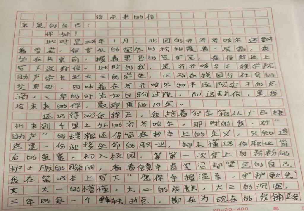 四封书信,四种心境,一段成长。这几名助产学子的笔墨,既是个人青春的印记,更是齐齐哈尔工程学院“中而致庸,和而不同”校训精神的生动实践。未来,相信更多齐工程学子将延续这份初心,在坚守正道中追求卓越,在兼容并蓄中彰显个性,书写属于新时代青年的担当与荣光。