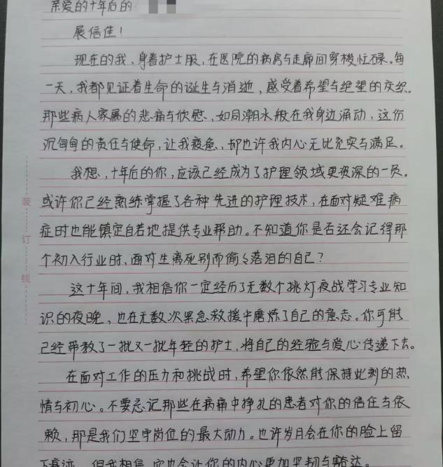 迟雪同学在信中写道,未来的自己,愿成为产房里最温暖的光。从青涩的志愿报到者成长为专业的助产士,用温柔安抚产妇的焦虑,用专业迎接每一声清脆啼哭,坚守初心,不负生命相托,在守护新生的道路上步履不停,始终心怀热爱与敬畏。