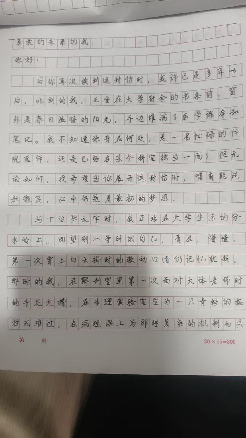 我校学生王涛积极参与 “给未来的自己” 主题活动,提笔写下一封情真意切、满怀期许的书信,与未来的自己展开一场真诚而深刻的对话。在信中,他细细回顾一路走来的求学时光,细数成长中的点滴收获与宝贵感悟,坚定表达了对所学专业的热爱与执着追求,更深情展望了未来投身中医药事业、传承国粹、服务大众的远大理想。