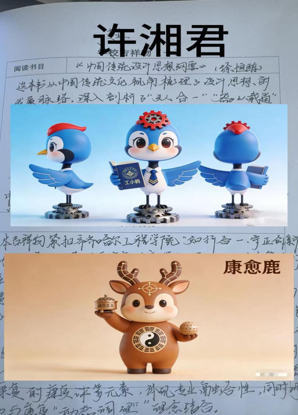许湘君同学结合人工智能设计的,吉祥物工小鹤(校本部):以“精工笃学,鹤舞致远”为精神内核,蓝羽映初心、齿轮承匠心,手持书卷、脚踏机械,将工程人的严谨务实与鹤城的灵动风骨结合,彰显学院“知行合一,精工强国”的育人追求,寓意学子以知识为翼、以技术为基,在时代浪潮中振翅翱翔。康愈鹿(医学院):以“康愈济世,仁心笃行”为核心理念,鹿角如经络、腹有太极,手捧艾灸与理疗球,将中医康养的温润智慧与现代康复医学相融,象征医学院学子以仁心护佑生命、用专业疗愈身心的使命担当,传递“守正创新,康泽众生”的医者情怀。