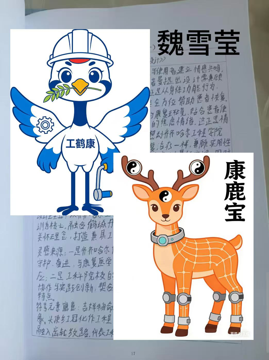 魏雪莹同学结合人工智能设计的,吉祥物“工鹤康”与康复治疗学专业吉祥物“康鹿宝”正式亮相“工鹤康”以丹顶鹤为原型,头戴安全帽,衔着象征希望的橄榄枝,翅膀上的齿轮彰显工科底蕴,手持握力器,寓意守护健康与安全,传递出学校“工学并举、守护安康”的办学理念。“康鹿宝”以小鹿为载体,融入太极、经络等传统康复元素,搭配智能护具,既体现中医康复的深厚底蕴,又彰显现代康复技术的创新活力,精准诠释了康复治疗学“医工结合、守正创新”的专业内涵。