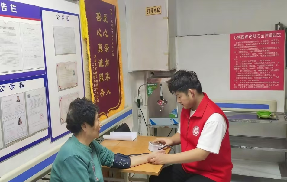李泳昊同学则发挥专业所学,为老人们提供细致的血压测量与健康咨询服务。他一边操作仪器,一边用通俗的语言讲解日常保健知识,并针对异常数值给出贴心的生活建议。专业的服务和耐心的讲解,让老人们对自己的健康状况有了更清晰的了解,也感受到了来自晚辈的切实关怀。