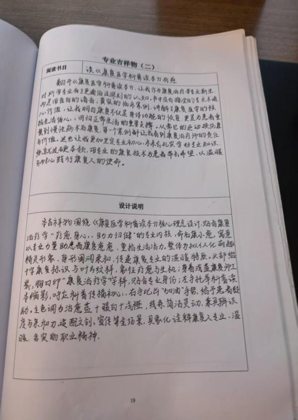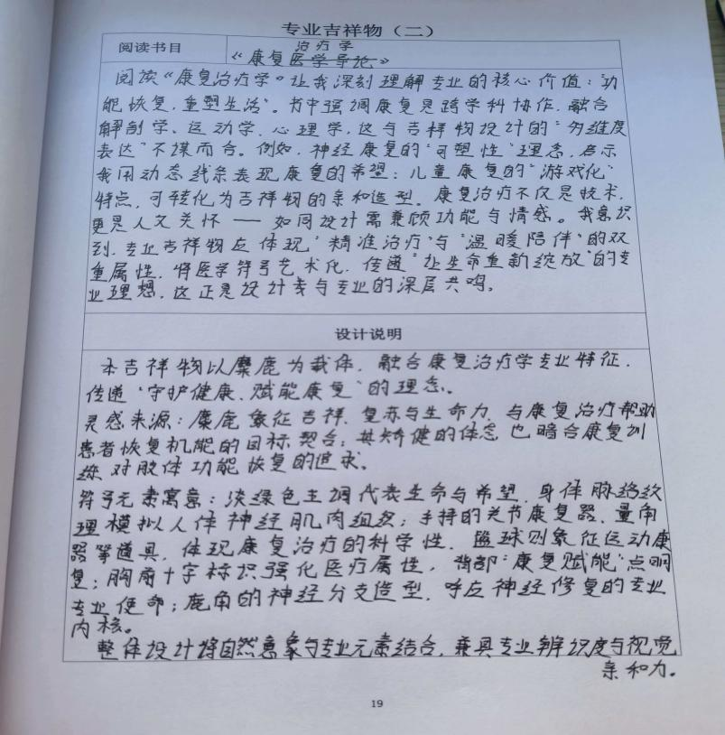 杜怡婷同学以《设计中的人文关怀》《运动疗法技术学》为蓝本,设计了学校吉祥物与康复治疗学专业吉祥物,实现专业精神与校园文化的深度融合。学校吉祥物秉持“中而至庸,和而不同”,蓝红主色调,造型圆润,胸前徽章呼应校园精神,具象化“化蛹为蝶、好梦成真”的愿景。专业吉祥物为萌态小熊,饰以绷带、听诊器,“康”字与蓝色十字凸显专业属性,融入运动疗法元素,兼具亲和力与专业感,传递人文关怀。