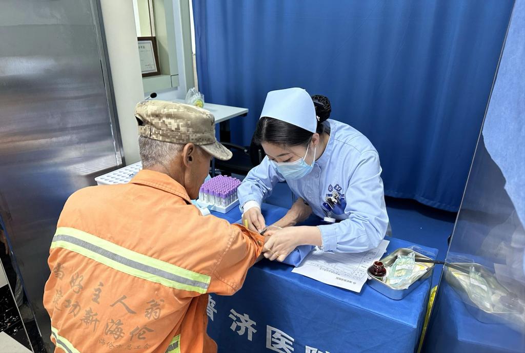 于淼在海伦市普济医院联合市总工会,为环卫工人开展免费健康体检活动。活动现场,医护人员为身着橙色工装的环卫工人们进行采血、血压测量等项目检查,细致记录健康数据。这些“城市美容师”常年坚守一线,用汗水守护城市整洁,此次活动为他们送上专业的健康关怀,让他们在辛勤工作之余,切实感受到来自社会的温暖与保障,增强了职业获得感与幸福感。 张碧均在社区支援服务中为高龄老人提供免费血压测量等居家健康服务。志愿者们耐心细致地操作仪器,细致询问老人的身体状况,用专业与温情守护社区老人的健康安全。对于行动不便的老人,志愿者主动搀扶、贴心照料,详细讲解健康注意事项,让老人们足不出户就能享受到便捷的医疗关怀,传递了邻里互助的正能量,也让社区成为更有温度的家园。