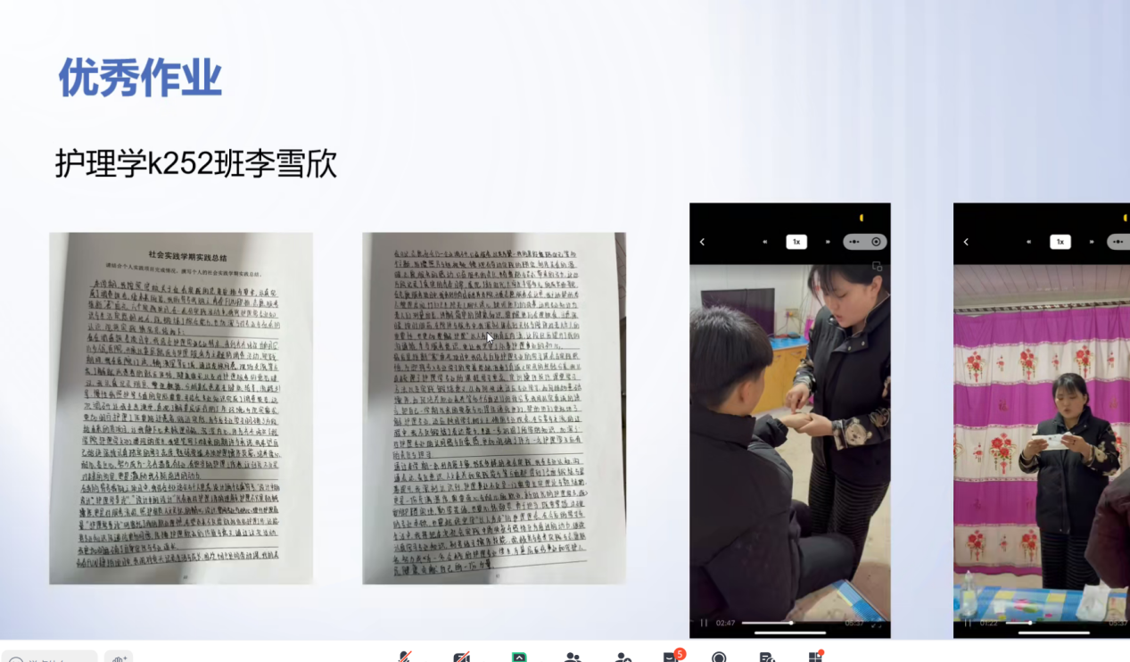 随后,055组、048组同学依次进行小组作业情况汇报。055组整体围绕社区健康服务完成专业技能练习,规范记录生命体征测量、基础护理操作、急救知识演练等实践内容,完成企业调研、志愿服务等综合实践活动。048组由多位同学协作完成任务,按时提交了专业手册、实践总结、疾病康复健康宣教及穴位敷贴等相关视频二维码,圆满完成各项作业要求。