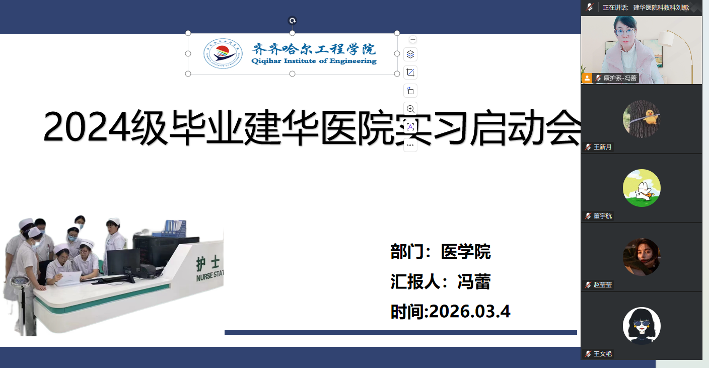 今日,召开2024级护理专业实习启动会。本次会议由冯蕾老师主持,医院相关负责人,2024级护理实习生共同参加,为即将开启的临床实习生涯拉开序幕。会议伊始,冯蕾老师代表医院对全体实习生的到来表示热烈欢迎。她指出,护理实习是理论联系实践、锤炼专业技能、培育职业精神的关键阶段,是每一位准护士成长路上的重要一课。冯蕾老师强调,医院高度重视护理人才培养工作,将为同学们提供规范、严谨、安全的实习平台,希望全体实习生珍惜机会、端正态度,以饱满的热情和认真的态度投入实习,在实践中增长本领、锤炼品格。