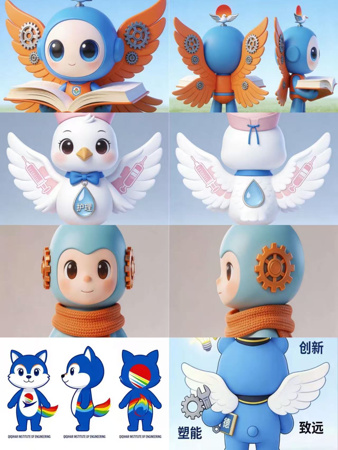 本设计以科技感人偶为核心形象,呼应学院工科属性与产教融合特色。主色调采用清新科技蓝,象征创新与严谨;头部两侧的橙色齿轮,既代表工程制造的核心元素,也寓意“知行合一”的实践精神;暖橙色针织围巾,融入齐齐哈尔地域的冬日质感,传递温暖包容的校园氛围。整体造型圆润亲和,兼具辨识度与传播性,既体现“中而至庸,和而不同”的校训,又彰显学院培养应用型人才的育人目标。
