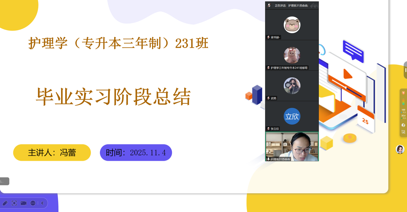 2025年11月4日,冯蕾老师借助腾讯会议平台,召开了毕业实习专题线上会议。会议围绕毕业实习的具体安排、成绩构成等核心内容展开系统讲解,助力毕业生清晰把握实习期间的关键要点。