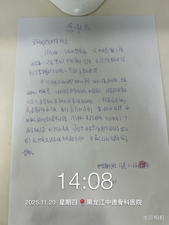 20日,齐齐哈尔工程学院校外课堂学生李学明在黑龙江中德骨科医院实践期间,收到患者康叔叔亲手写下的感谢信。信中,康叔叔对李学明在自己手部骨折治疗期间所表现出的专业护理与暖心服务,表达了诚挚的谢意。