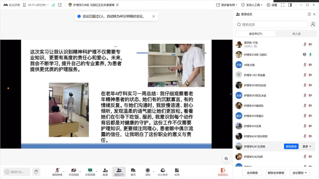 会议最后,指导教师进行了总结和点评。他充分肯定了实习护士们在第一周实习中的表现,同时也指出了他们在工作中存在的不足之处,并提出了改进建议。于佳老师还强调了实习手册的填写要求,要求学生们及时、准确地记录实习过程中的各项内容,以便更好地总结经验、反思不足。此次“周总结”主题会对于同学们来说是一次难得的学习机会。整场会议气氛热烈而融洽,同学们纷纷表示受益匪浅。他们表示将继续努力学习和实践,不断提升自己的专业素养和服务水平,为病人的健康和福祉贡献自己的力量。