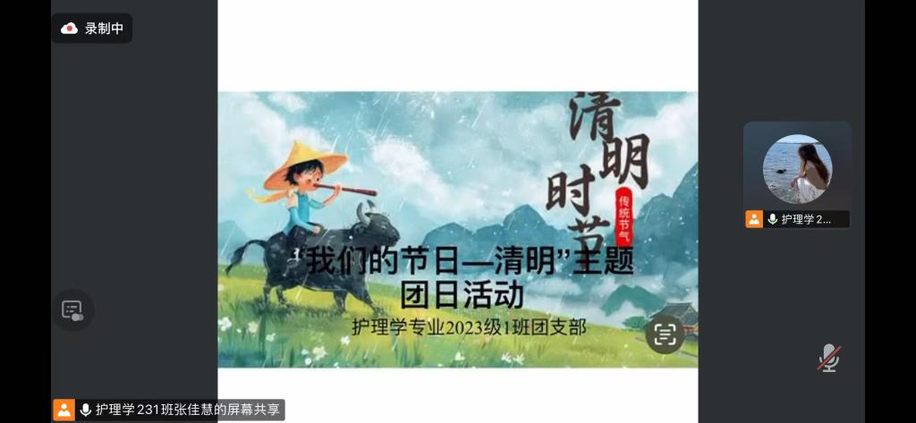为切实将党的二十大精神内化于心、外化于行,深入落实习近平总书记关于珍视红色资源、传承红色血脉的系列重要指示,充分挖掘中华传统佳节的思政教育价值,护理学 2321班于 3 月 29 日精心筹备并顺利开展了“清明追思,传承荣光——我们的节日”主题团日活动。本次活动依托腾讯会议线上平台,由团支书张佳慧全程主持,力求引领班级全体青年筑牢爱国主义根基,让红色薪火代代相传,护理学 231班全体同学无一缺席,全员参与其中。