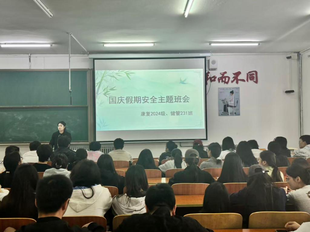 为强化学生安全防范意识,保障国庆假期平安,9月25日康复治疗学242班于一号教学区1101教室组织开展“国庆假期安全”主题班会,班会由辅导员李安琪老师主持,康复治疗学242班全班同学参加。
