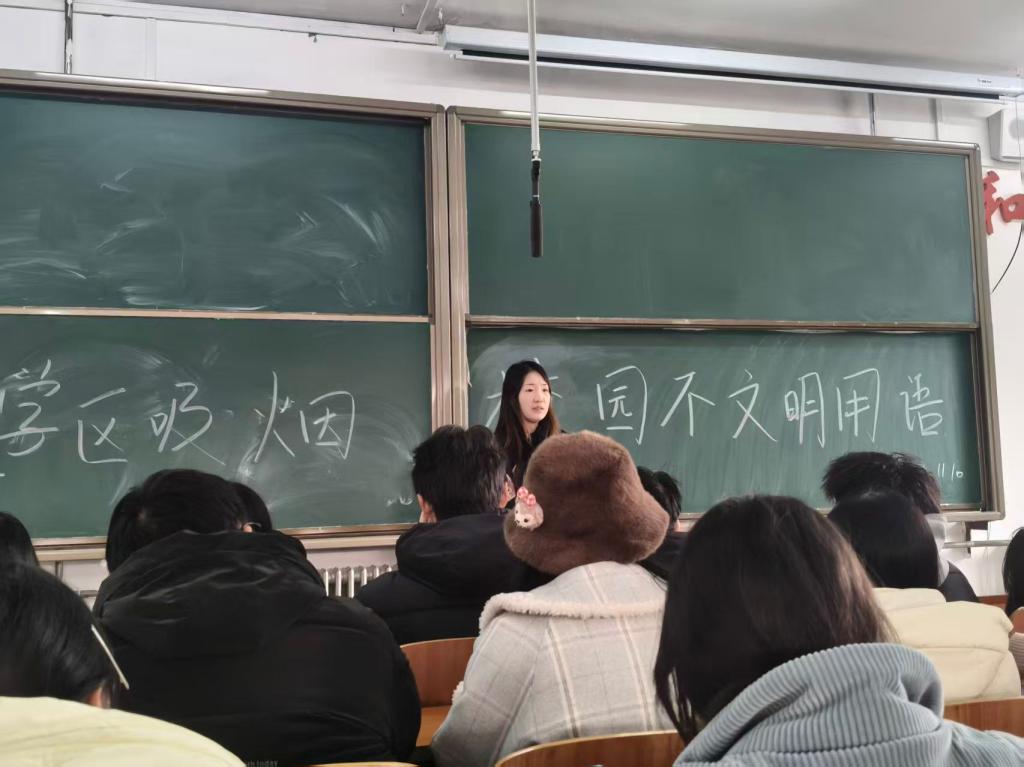 会议伊始,导员李妍向大家阐述了吸烟的危害并条理清晰地让同学们认识到无烟课堂的必要性,接着她详细介绍了学校设立的指定吸烟点,明确行为边界。教学区是师生授业解惑、潜心钻研的核心场所。吸烟不仅影响环境,也会危害他人健康并带来安全隐患。确保教学区“无烟尘之扰,有翰墨之香”,是维护校园文明形象的必然要求。