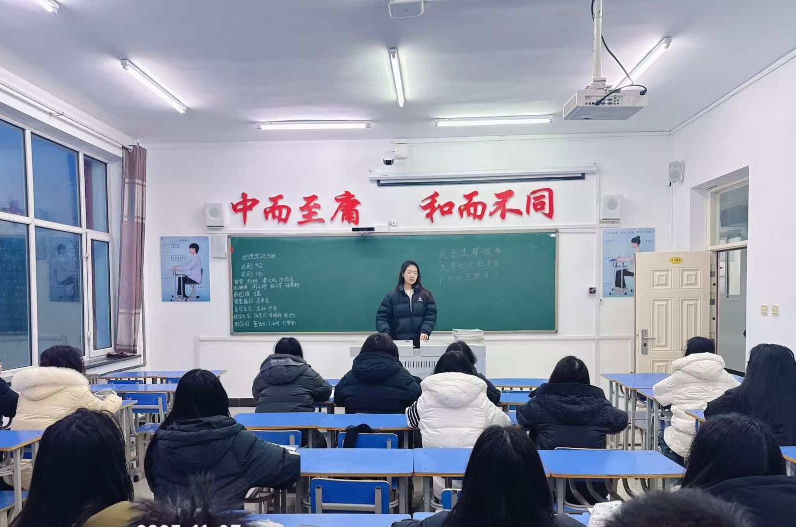 为整治校园不文明现象,引导学生树立良好言行准则,护理学253班于11月28日在一号教学楼1207教室开展“行为规范教育”主题班会,本次会议由辅导员李妍老师召开,护理学253班全体同学参加 。