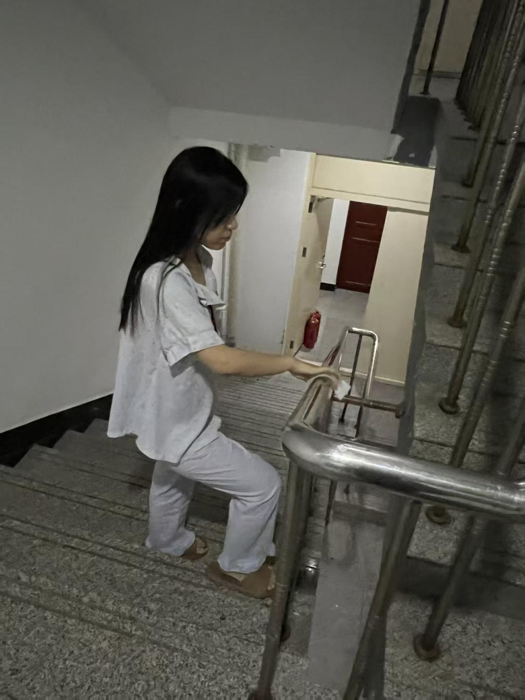 开场培训结束后,各干部领取物料,按照规范对宿舍内床底、桌面、门把手等重点区域开展消毒工作;现场协助人员穿梭于各区域,巡查消毒进展,及时指导规范操作,解决干部们遇到的消毒难题。与此同时,公共区域的消毒工作也在工作人员的分组协作下有序推进,走廊、楼梯扶手、电梯按键等公共触点均被细致消杀,确保无遗漏。
