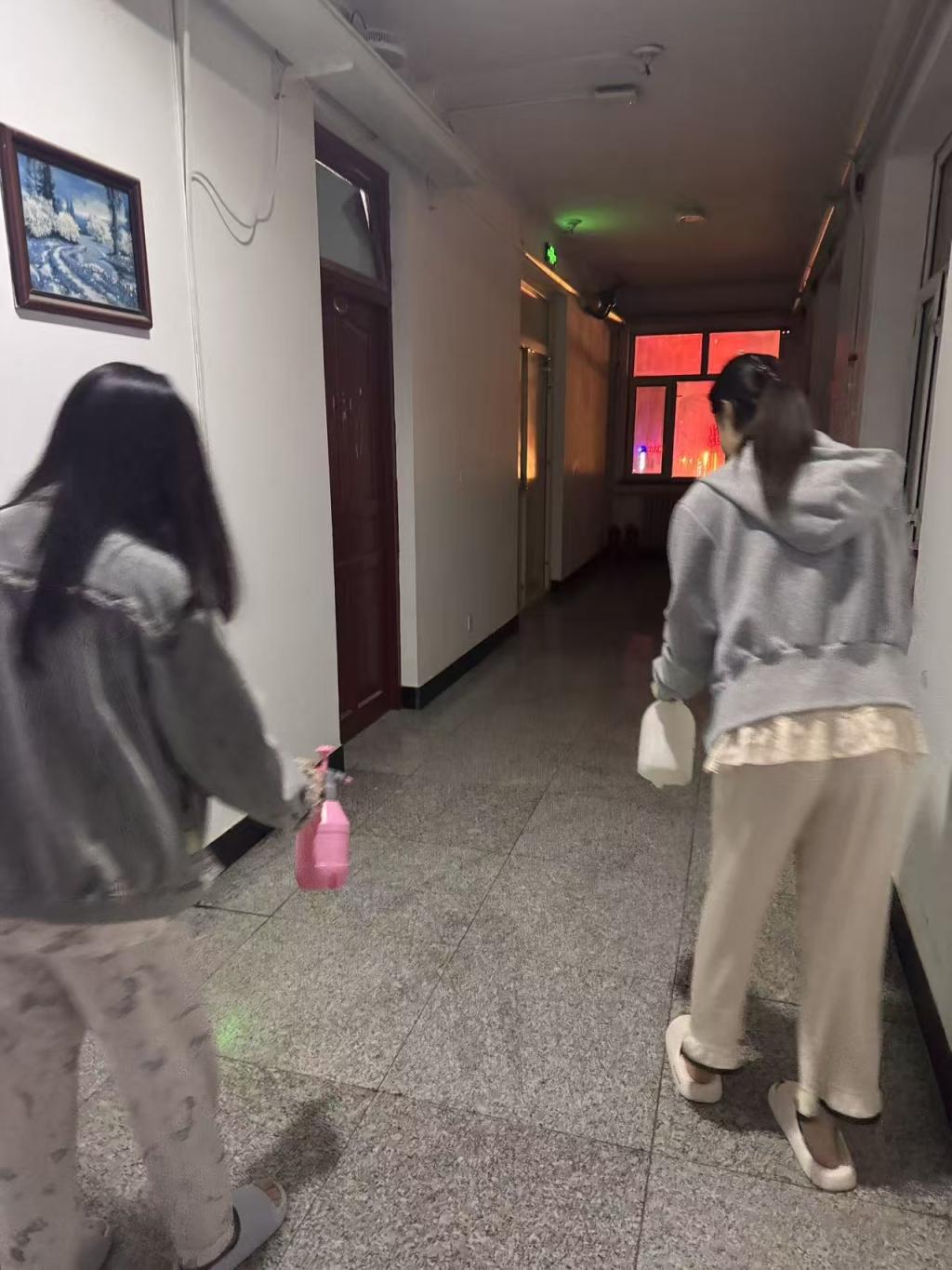 消毒过程中,公寓干部们热情高涨:有的分工明确,一人负责配置消毒液,一人负责擦拭桌面,一人负责清扫床底,默契的配合让消毒效率大幅提升;有的主动帮助隔壁宿舍搬运物料、分享消毒技巧,互助的暖流在公寓里涌动。原本略显枯燥的消毒工作,因集体参与和协作互动变得生动有趣,干部们在动手实践中,不仅掌握了实用的预防病毒技能,更深化了彼此间的情谊。