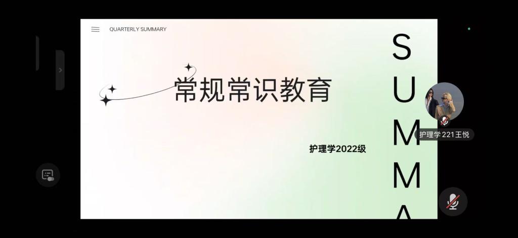 为进一步加强护理实习生在校外实习期间的规范管理,提升学生的安全意识和职业素养,2026年3月23日,护理学22级分别在腾讯会议组织召开了“常规常识教育”主题班会。本次班会由辅导员李安琪老师主持,全体护理学22级学生参加。