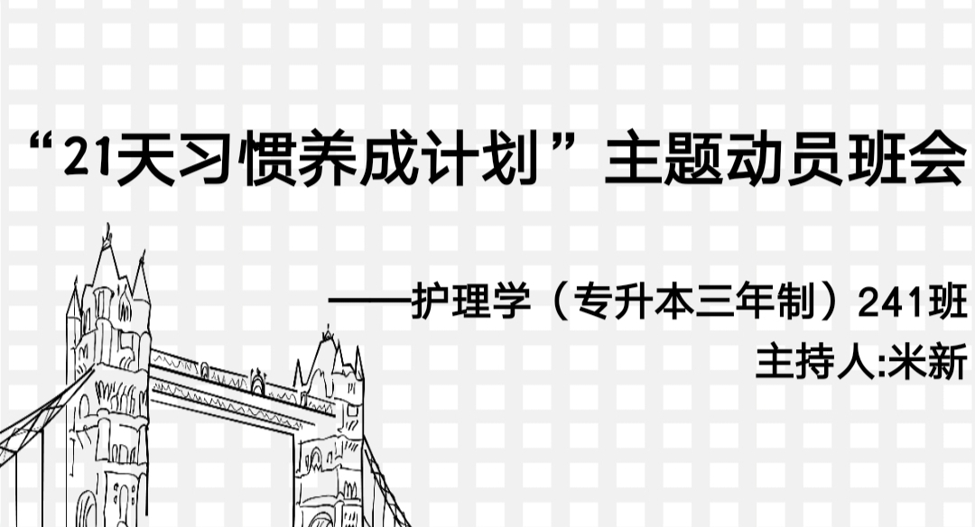 为了落实学校21天习惯养成计划部署,引导学生树立自律意识,明确打卡要求,积极参与主题打卡活动,护理学(专升本三年制)241班于3月20日11:45在腾讯会议组织开展线上“21天习惯养成计划”主题动员班会,会议由辅导员米新主持,护理学(专升本三年制)241班全体同学参加。