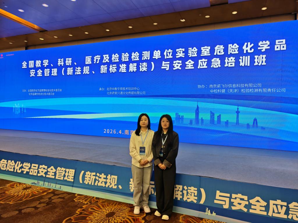 为深入贯彻落实国家关于危险化学品安全管理的最新法规标准要求,全面提升高校实验室安全管理水平,有效防范化解实验室安全风险,2026年4月17日至20日,我院大健康教育省级实验教学示范中心实验技术人员杨扬、路悦怡赴南京参加“2026年春季——全国教学、科研、医疗及检验检测单位实验室危险化学品安全管理(新法规、新标准)与安全应急培训班”。